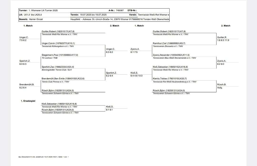 Das 1. Wismarer LK-Turnier lockte 3 (4 Anmeldungen, aber 1 Absage am Turniertag) Herren 50 aus ganz Deutschland, leider niemand aus MV, an. Bei den Herren waren es immerhin 10 Teilnehmer, die überwiegend für den TMV an den Start gingen. 2 Wismarer Teilnehmer waren auch zu verzeichnen. Robert Gurtler stellte sich der offenen Klasse und war der Zweitälteste Teilnehmer (Ü40). Sebastian Kloß gewann 2 Matches und freute sich über Balldose, Honig und Sekt als Preis.